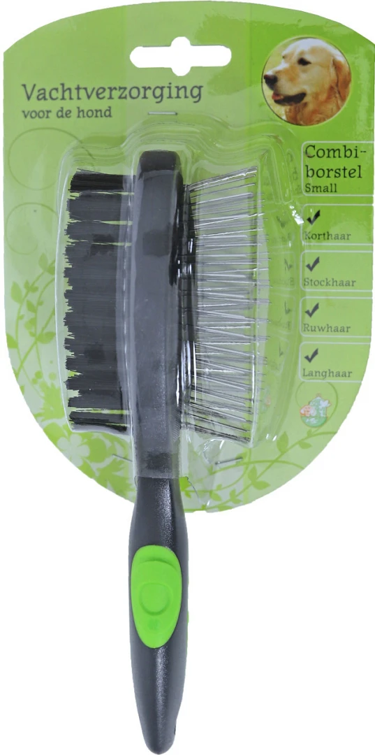 Deze borstel combi 2 zijdig small verzorgt de vacht van jouw hond door middel van het verwijderen van losse en dode haren. De nylon zijde van deze combiborstel is geschikt voor alle soorten honden, ongeacht de vachtsoort, de stalen zijde kun je het beste gebruiken voor honden met een stokhaar- of langharige vacht.
